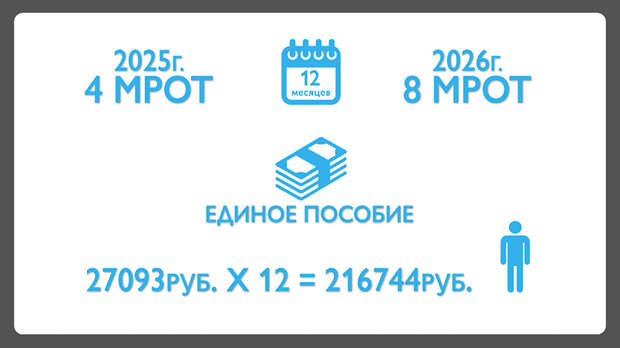 Ключевое изменение этого года касается дохода, который необходимо иметь для получения единого пособия. Делают это, чтобы исключить людей, которые могут, но не хотят работать. Существует минимальный порог. С этого года он повышен до восьми МРОТ (в 2025 году было четыре МРОТ) за расчётный период. Это 12 месяцев. Федеральный МРОТ в 2026 году составляет 27 тысяч 93 рубля, то есть восемь МРОТ – 216 744 рубля. Вот эту сумму должен заработать каждый трудоспособный член семьи.