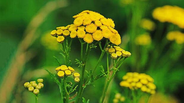 Пижма обыкновенная (Tanacetum vulgare), известна также как дикая рябинка. Её соцветия ярко-жёлтые, похожи немного на рябину.
