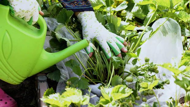 Как сделать так, чтобы ягоды выросли покрупнее? Для этого приготовим специальную жидкость. В литре воды разведём две капли самого лучшего стимулятора роста. Натурального. Потом опрыскаем растение. Когда жарко и почва сухая, обязательно надо поливать землянику с небольшой подкормкой. Добавляем в воду гумат калия для ягодных культур. Одну столовую ложку на два или два с половиной литра воды. Поливаем аккуратно, в самую середину кустика.