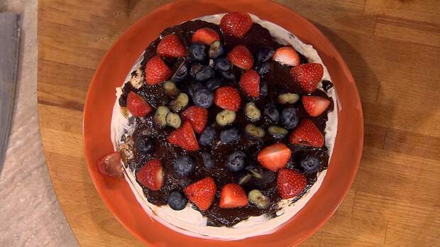 Теперь декор. Шоколад со сливками и маслом растапливаем на водяной бане, аккуратно перемешиваем и выливаем на верхушку десерта. Медленно размазываем ложкой, стараясь не заходить за края тортика. Потом украшаем свежими ягодками и светлым кремом.