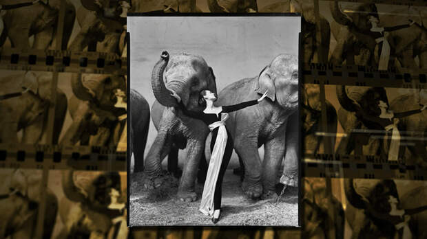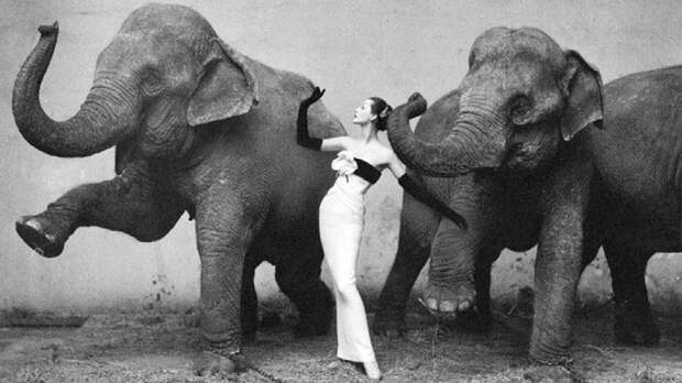 Фотография "Довима и слоны" была снята в 1955-м в здании зимнего цирка в Париже. Ричард Аведон вспоминал: "Я увидел слонов, и сразу всё понял. Нужно было подобрать правильное платье, и я уже знал, что это должно быть похоже на сцену из сна". Эскиз удивительного платья создал 19-летний Ив Сен-Лоран. Это были его первые шаги в мире высокой моды.