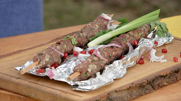 Мочим руки в уксусной воде, формируем из фарша продолговатые колбаски длиной не более 15 см и надеваем их на деревянные шпажки.