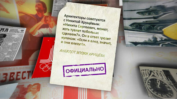 "Архитекторы советуются с Никитой Хрущёвым: "Никита Сергеевич, может быть, хоть туалет побольше сделаем?" Он в ответ грозит кулаком: "Если я влез, значит, и они влезут". Анекдот эпохи Хрущёва.