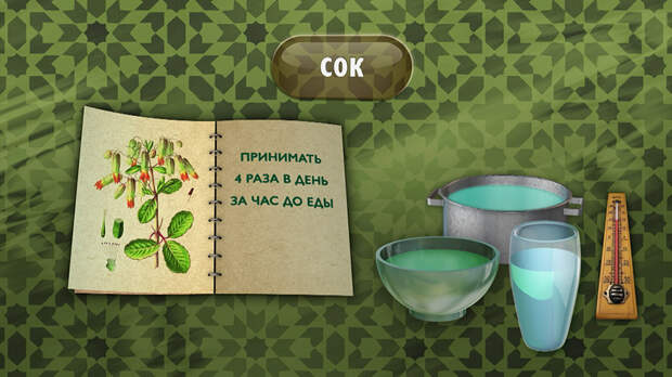 Подготовленные части растения измельчить в блендере, полученную массу процедить через мелкое сито или несколько слоёв марли. Готовый сок перелить в стеклянную ёмкость и хранить в холодильнике.Перед применением нагреть на водяной бане до комнатной температуры. Налить полстакана тёплой воды, добавить туда чайную ложку сока каланхоэ. Пить четыре раза в сутки за час до еды.