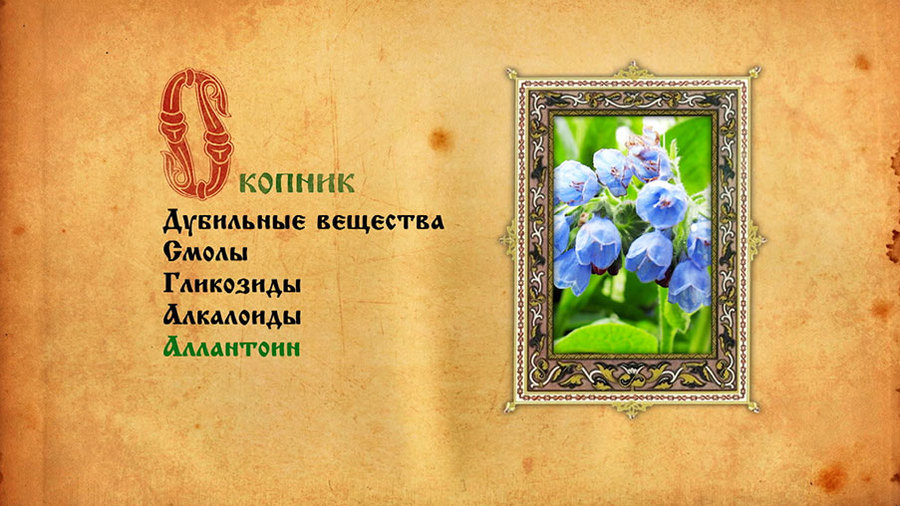 Корень окопника имеет необычный состав. Помимо витаминов, микро- и макроэлементов, органических кислот, эфирных масел, дубильных веществ, смол, гликозидов и алкалоидов, в окопнике выявлено активное вещество аллантоин, обладающее вяжущими, противовоспалительными и обезболивающими свойствами.