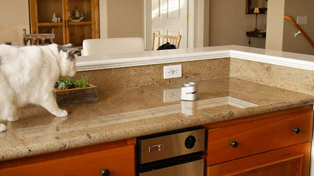 Хотите раз и навсегда отучить домашних питомцев запрыгивать на стол? Тогда этот маленький робот изобретён специально для вас. Спросите, как он пугает котов? Проще простого! Во-первых, прибор всегда знает, с какой стороны стола находится животное. В этом ему помогает датчик на ошейнике. Как только хвостатый нарушитель запрыгнул на стол, в дело вступает ультразвуковой сигнал.