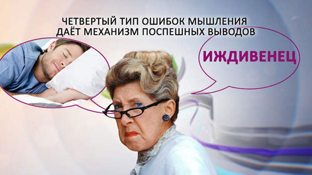 Третий тип ошибок связан с эффектом ореола или первого впечатления, которое "работает" настолько сильно, что остальная информация практически пропадает. Четвёртый тип ошибок можно условно назвать механизмом поспешных выводов. Разум строит картину происходящего только на основе того, что видит в данный момент. Вы можете долго доказывать соседям, что работаете в ночную смену, но если, когда они приходят, вы всегда дома, то скоро к вам прилепится прозвище "иждивенец".