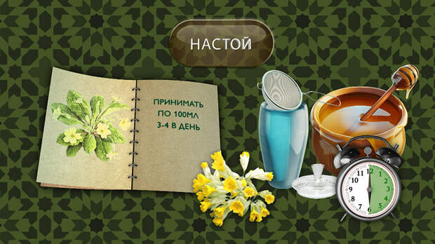 Готовый настой пить в тёплом виде по 100 миллилитров три–четыре раза в день, можно с мёдом.Из корневищ первоцвета готовится отвар. Чайную ложку измельчённого сырья залить водой, кипятить на слабом огне 10–15 минут, после настоять полчаса и процедить. Принимать полстакана или треть перед едой три раза в день.