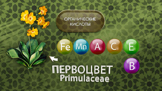 В состав первоцвета входят: сапонины, каротиноиды, гликозиды и эфирное масло, органические кислоты и минеральные вещества – железо, марганец, витамины А, С, Е и группы В. Сапонины, которые накапливаются в корнях первоцвета, обладают мощным отхаркивающим действием. Флавоноиды, витамин C и каротиноиды обеспечивают антиоксидантное действие. Салицилаты отвечают за противовоспалительное, обезболивающее действие. Эфирное масло и дубильные вещества ответственны за спазмолитическое, седативное действие.