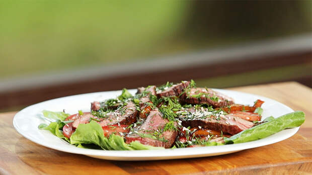 Тёплый салат с мясом и печёным перцем