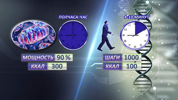Активация митохондрий происходит при выполнении работы, эквивалентной 1000 шагам. То есть нужно потратить примерно 100 калорий. Это обычно 8–10 минут умеренной физической активности. Считается, что митохондрии выдают 90% мощности при ежедневных энергозатратах в 300 калорий. Это всего полчаса-час работы в день. То есть за два выходных дня мы реально можем постареть или помолодеть, поэтому старайтесь прислушиваться к себе за работой.