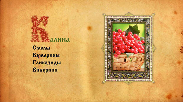 Не зря в народе говорят: "Кто с калиной дружен, тому врач не нужен!" В этой ягоде содержатся витамины С, А, Р, К, Е, а также многие ценные органические кислоты, минералы, дубильные вещества, смолы, кумарины и гликозиды, в том числе вибурнин, придающий плодам горьковатый вкус.