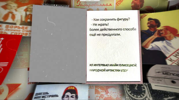 Легендарная фраза балерины стала девизом советских красавиц. На звёзд хотелось ориентироваться во всём, в том числе и в вопросах питания. Диета Орловой, диета Гурченко. Способы похудания приписывали самым красивым артисткам. Они, правда, далеко не всегда даже знали об этом. Смотришь на Гурченко и думаешь: "Разве бывает такая талия? Пойду сварю кашу на воде... О, "Ну, погоди!" начинается. Дети, скорей к телевизору!" Советские мультфильмы. Но об этом – в следующий раз.