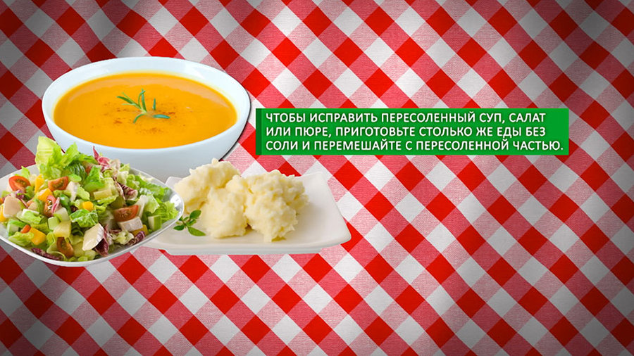 Главные борцы с пересолом в наших блюдах – кислота, жир и крахмал. Если вы пересолили суп, киньте в него пару крупных очищенных и порезанных на четыре части картофелин, а после того как они будут готовы, выньте и сделайте пюре. Если суп всё ещё слегка пересолен, выжмите в него немного лимонного сока – блюдо на вкус станет пикантным, и пересол чувствоваться не будет.