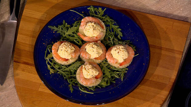 Всё это заправляем йогуртом, перемешиваем и раскладываем ложкой поверх ананасов. Далее на каждое кольцо сырно-яичной массы кладём креветку. Наша закуска готова!