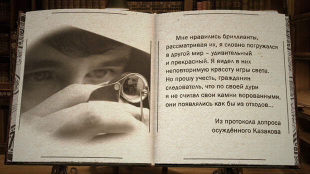 "Мне нравились бриллианты, рассматривая их, я словно погружался в другой мир – удивительный и прекрасный. Я видел в них неповторимую красоту игры света. Но прошу учесть, гражданин следователь, что по своей дури я не считал свои камни ворованными, они появлялись как бы из отходов..." Из протокола допроса осуждённого Казакова.