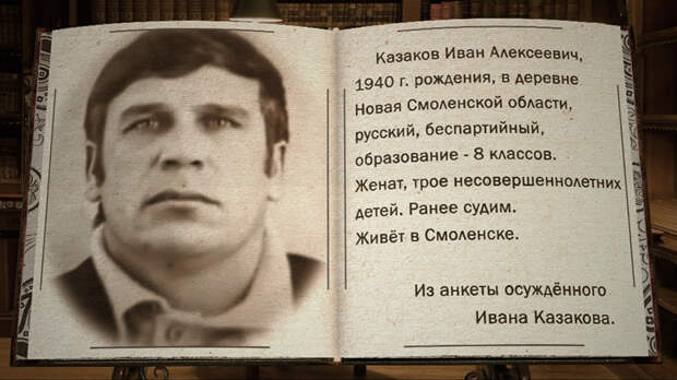 "Казаков Иван Алексеевич, родился в 1940 году в деревне Новая Смоленской области, русский, беспартийный, образование – 8 классов. Женат, трое несовершеннолетних детей. Ранее судим. Живёт в Смоленске". Из анкеты осуждённого Ивана Казакова.