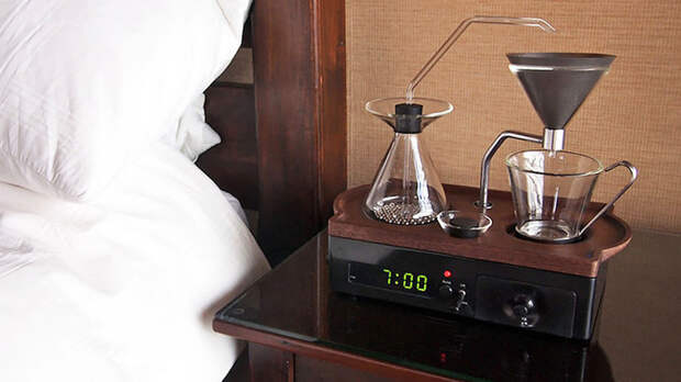 Правильное утро должно начинаться с бодрящего кофе, а не со звенящего будильника. В Великобритании изобрели устройство, которое сначала разбудит "бодрым" писком, а потом тут же, в качестве компенсации, сварит отличный кофе. Дизайн этого гаджета по-английски изысканный: деревянный корпус, индукционный нагревательный элемент, стеклянная колба с трубочкой и элегантные выдвижные ящички.