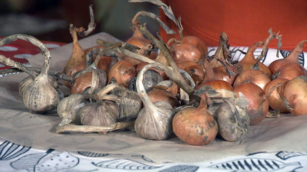 Разложите лук и чеснок на чистой бумаге и оставьте на пару дней в сухом тёплом месте на проветривание.