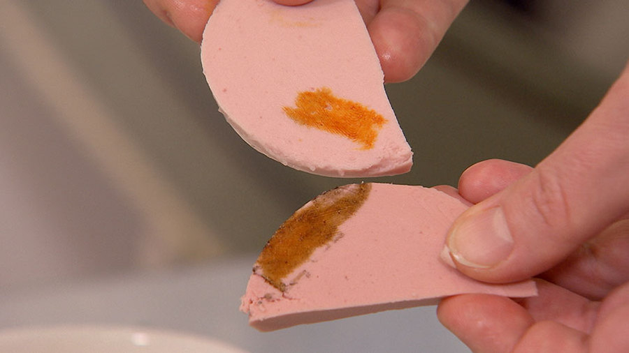 – Изменение окраски говорит о том, что в колбасе присутствует крахмал.