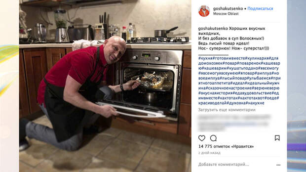 Гоша Куценко рассказал и показал, каким должен быть идеальный повар. За эталон кулинара он, разумеется, взял самого себя: "Хороших, вкусных выходных! И без добавок в суп волосяных! Ведь лысый повар – идеал! Нос – супернюх! Нож – суперстал!" Похоже, Гоша – не только отличный артист, певец и кулинар, но ещё и поэт. "Хозяюшка", "Эх, мне б такого повара", "Буду бриться наголо…" – пишут фолловеры. Похоже, "Клуб любителей лысого человека", который Гоша недавно создал, вскоре пополнится новыми участниками.