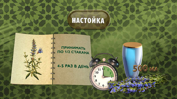 Одну горсть травы иссопа залейте половиной литра кипятка и настаивайте 2-3 часа под крышкой. Принимать такой настой следует по половине стакана четыре-пять раз в день.