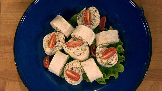 Раскладываем на столе лаваш. Выкладываем на лаваш начинку и разравниваем её по всей поверхности. В конце нужно только оставить нетронутыми 2–3 см, чтобы начинка при сворачивании не вылезла наружу. Сформировать рулет. Положить его в холодильник на 30–60 минут. За это время он успеет пропитаться и размягчиться. Достать и порезать острым ножом. При подаче украсить рулетики из лаваша с крабовыми палочками петрушкой, укропом и зелёным луком.