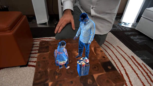 Эта новая технология сканирует собеседника в реальном времени, создаёт 3D-модель и "натягивает" на неё примерно похожие текстуры. Выглядит это как волшебство, однако, надо понимать, что и у вас, и у родственников должны быть особым образом выставлены камеры и подключено дорогостоящее оборудование. А если всё сделано как надо, то кроме потрясающего виртуального общения, можно оставить себе 3D-ролик на память. Вы можете видеть сцену со всех сторон, обходить каждого человека или уменьшить сцену так, чтобы посмотреть на всё происходящее глазами великана.