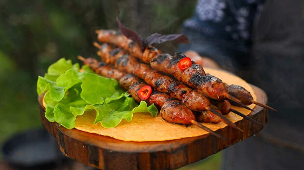 Шашлык из куриных сердечек в томатном соусе