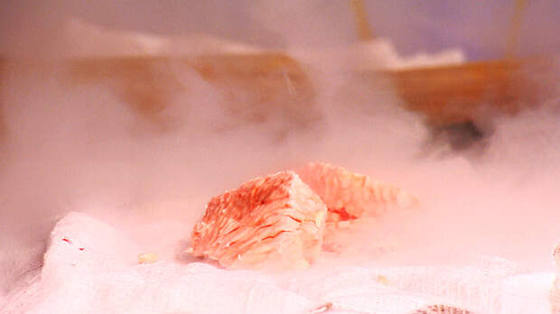 – Жидкий азот применяют и в кулинарии. Так как он очень холодный, то полностью испаряется из продуктов питания. Именно поэтому его можно использовать для готовки еды. Например, мы хотим как следует заморозить грейпфрут. Для этого потребуется буквально минута. Сразу после заморозки грейпфрут лучше не трогать руками, иначе можно обжечься, он очень холодный. И дальше одним магическим движением превращаем всё это в икру из грейпфрута.