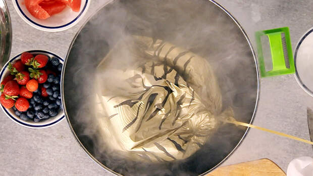 Главное блюдо – мороженое с азотом. Берём мяту и цедру лайма, выливаем туда жидкий азот. Продукты от быстрой заморозки не портятся. Наоборот, если это шоковая заморозка, то полезные вещества не теряются. Важно понимать, что нужно всегда дождаться, пока температура перестанет быть экстремальной.