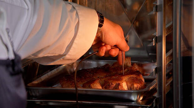 – Я протыкаю мясо до конца, смотрю, сколько у меня полностью протыкается, беру ровно половину и протыкаю мясо до половины. Так мясо равномерно прожарится и именно в середине оно будет нужной температуры.