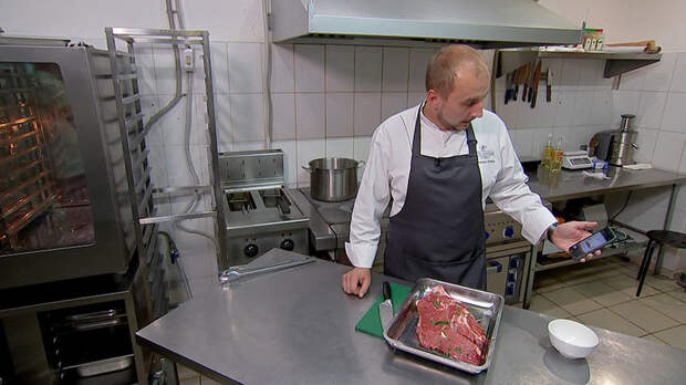 – Выбираем стандартный метод, поверхность, на которой будем жарить, и толщину. Стейк у нас очень широкий, поэтому выбираем самую большую. Теперь мы располагаем стейк, нажимаем "старт" – и отсчёт пошёл.