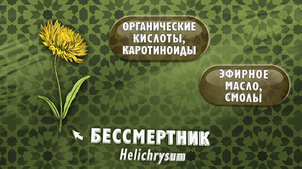 В состав бессмертника входят: флавоноиды, кумарины, дубильные вещества, тритерпеновые сапонины, эфирное масло, смолы, органические кислоты, каротиноиды. Флавоноиды (кверцетин, апигенин) укрепляют капилляры, снижают проницаемость сосудов, мощные антиоксиданты. Органические кислоты и кумарины устраняют спазмы в желчных протоках, а эфирное масло обладает антибактериальным и ранозаживляющим действием.
