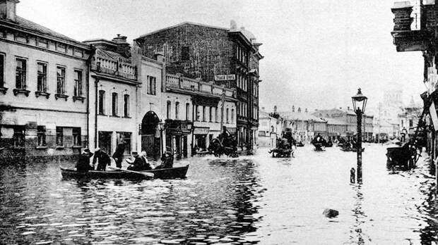 Одно из крупнейших наводнений в истории Москвы произошло 23 апреля, в Страстную пятницу високосного 1908 года. Вода в реке поднялась на девять метров. Замоскворечье ушло под воду так глубоко, что над поверхностью еле виднелись фонарные столбы. Ни пройти, ни проехать было невозможно. По улицам потоком несло брёвна, бочки и целые избы. Несмотря на ужас происходящего, москвичи отнеслись к наводнению как к романтическому приключению: катались на лодках и фотографировались на фоне московской Венеции.