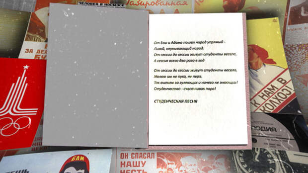 "От Евы и Адама пошёл народ упрямый, лихой, неунывающий народ. От сессии до сессии живут студенты весело. А сессия всего два раза в год. От сессии до сессии живут студенты весело. Желаю им ни пуха ни пера. Так выпьем за гуляющих и ничего не знающих. Студенчество – счастливая пора". Студенческая песня.