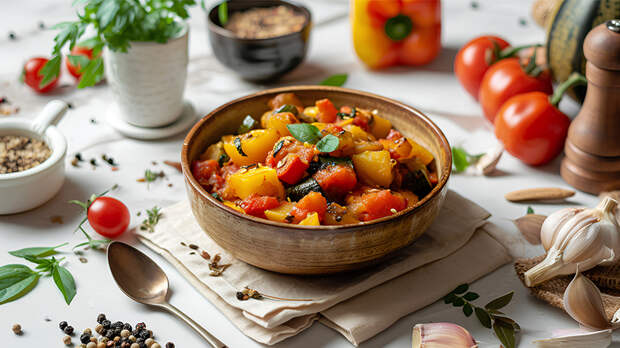 – Рататуй делается из баклажанов, цукини, перцев, помидоров, орегано, тимьяна, розмарина, соли, перца, оливкового масла и чеснока. Овощи режутся и готовятся по отдельности, чтобы потом их соединить, протомить в соусе и объединить вкусы. Главное – они не должны растомиться в полную кашу.