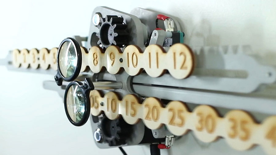 Что можно сделать с помощью лазерного резака, 3D-принтера и прямых рук? Конечно же, линейные часы! В них есть шаговый двигатель, управляемый специальным контроллером, позволяющим перемещать цифры. Интервал пятиминутный, что уменьшает шум часового движения. Когда час истекает, минутная шкала возвращается в исходную точку.