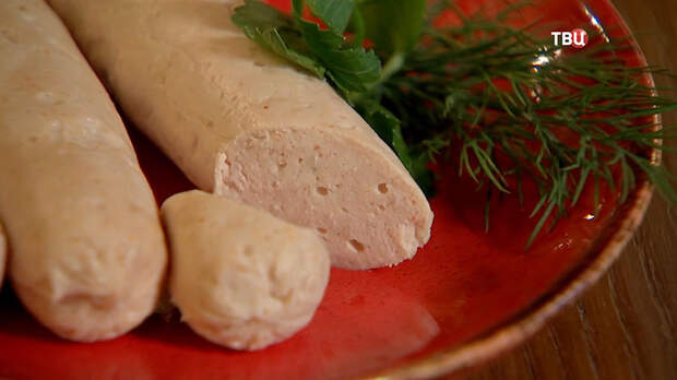 Выкладываем часть фарша на пищевую плёнку и сворачиваем сосиску. Варим 2–3 минуты, как и обычные магазинные полуфабрикаты.