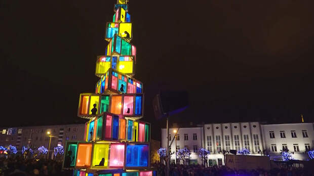 Ель в эстонском городе Раквере сделана из старых разноцветных оконных рам. В 2016 год сквозь цветные стёкла смотрят символичные жители и обитатели города.