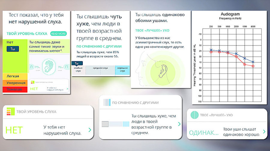Принцип работы таких приложений прост. Вы надеваете наушники, а программа подаёт звуки разной громкости и частоты. Услышали сигнали – нажали на экран. Звук исчез – отпустили. Результаты даются в процентах. Сразу же после теста мы видим, что левое ухо работает, допустим, на 79% от нормы, а правое – на 76%. Это значит, что у вас слабый слух. Кроме того, программа записывает аудиограмму, с которой можно идти к врачу или в магазин аудиотехники.