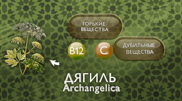 В состав дягиля входят: витамин В12, аскорбиновая, яблочная и уксусная кислоты, горькие и дубильные вещества, воск, смолы, кальций и фосфор.