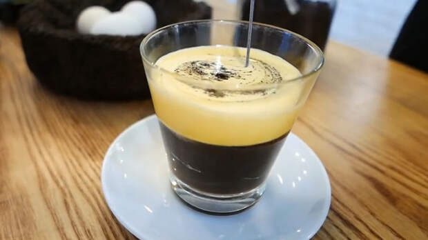 – Берём бокал, переливаем сначала смесь желтка и сгущённого молока и вливаем наш кофе. Он получается достаточно питательным и в принципе может даже заменить завтрак.