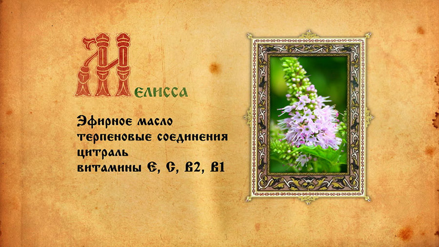 Кроме того, в мелиссе присутствуют витамины Е, С, В2, В1, а также каротин, горечи, кумарины, флавоноиды и дубильные вещества.Мелисса является важнейшим компонентом ароматических ванн для улучшения обмена веществ и при упадке сил. Рекомендуем следующий рецепт. Положим в кувшин по 1 столовой ложке травы мелиссы, тысячелистника, полыни горькой, душицы и зальём горячей водой. Через час настой нужно процедить и добавить в ванну, принимать которую следует в течение 15 минут.