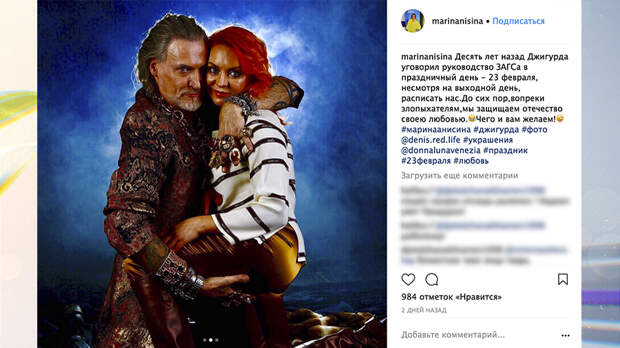 Никите Джигурде и Марине Анисиной было не до Дня защитника Отечества – они отмечали десятую годовщину свадьбы. Вроде бы супруги разводились, но кто теперь разберёт? "Джигурда уговорил руководство ЗАГСа в праздничный день 23 февраля, несмотря на выходной день, расписать нас, – проникновенно пишет Анисина и ловко подводит к общему празднику. – До сих пор, вопреки злопыхателям, мы защищаем Отечество своею любовью". Подписчики не знают, что и думать: был развод или не было развода? Вместе они или играют на публику? "Анисина заразилась Джигурдой. У неё нет собственного мнения", – подытожили комментаторы. Впрочем, выглядит парочка, как всегда, счастливой.