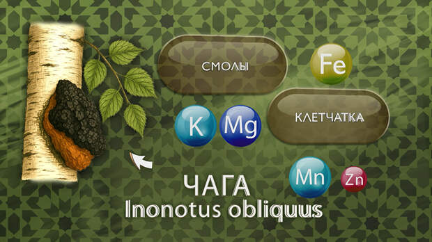 Чага содержит большое количество флавоноидов, клетчатки и смол, также богата микро- и макроэлементами: калием, магнием, железом, марганцем и цинком.