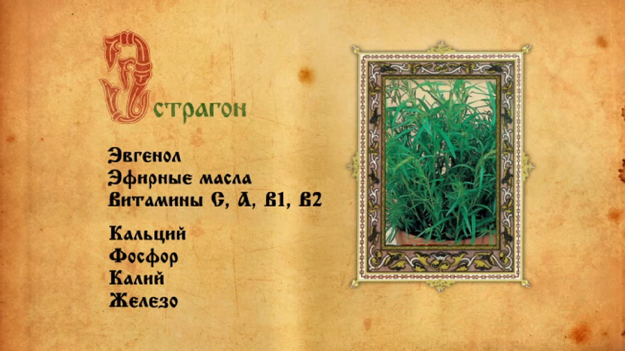 Современные исследования доказали, что содержащееся в эстрагоне душистое вещество эвгенол является сильным анестезирующим средством. В зелени этой травы находится много эфирных масел, витаминов С, А, В1, В2, а также значительное количество кальция, фосфора, калия и железа.