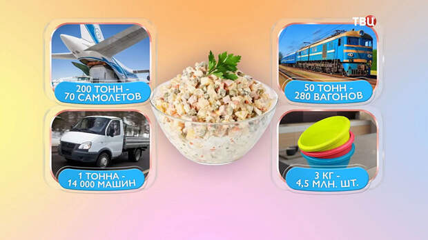 14 тысяч тонн оливье – именно столько, по нашим примерным подсчётам, будет съедено в России в ночь на 1 января. Каждому второму жителю страны мы выделили 200 граммов салата. Если бы всё это готовилось на одной гигантской кухне, то только для транспортировки главного новогоднего блюда понадобилось бы 70 гружённых под завязку самых больших транспортных самолётов или 280 товарных вагонов. Потом всё это пришлось бы разложить в 4,5 миллиона тазиков, ставших единицей измерения оливье.
