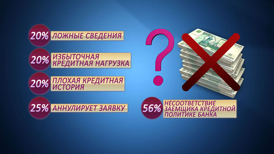 По каким причинам банки чаще всего отказывают в займе? Эксперты проанализировали сложившуюся практику. Во-первых, это несоответствие данных, указанных заёмщиком в анкете, то есть ложные сведения. Избыточная финансовая нагрузка и плохая кредитная история – на втором месте. На эти причины приходится 20% отказов. К тому же каждый четвёртый обратившийся сам не приходит за деньгами после одобрения, и заявка аннулируется. А самая массовая и вместе с тем самая загадочная причина отказа – несоответствие заёмщика кредитной политике банка. В чём заключается эта политика, узнать невозможно. Именно с такой формулировкой вынесено 56% отказов в кредите.