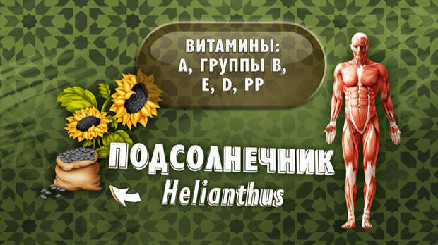 Семена подсолнечника – кладезь полезных веществ. Витамин Е замедляет старение, витамины группы B улучшают работу нервной системы, витамин А полезен для зрения. Фосфор, калий и кальций укрепляют костную ткань и предупреждают возникновение ревматизма.